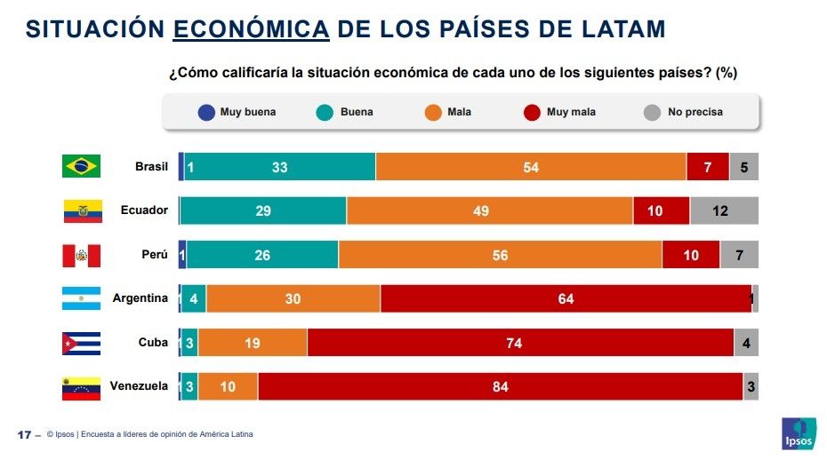 Uruguay y Chile también se posicionan entre los países con mejor situación económica según los encuestados. Argentina se encuentra antepenúltima solo superada por Cuba y Venezuela.