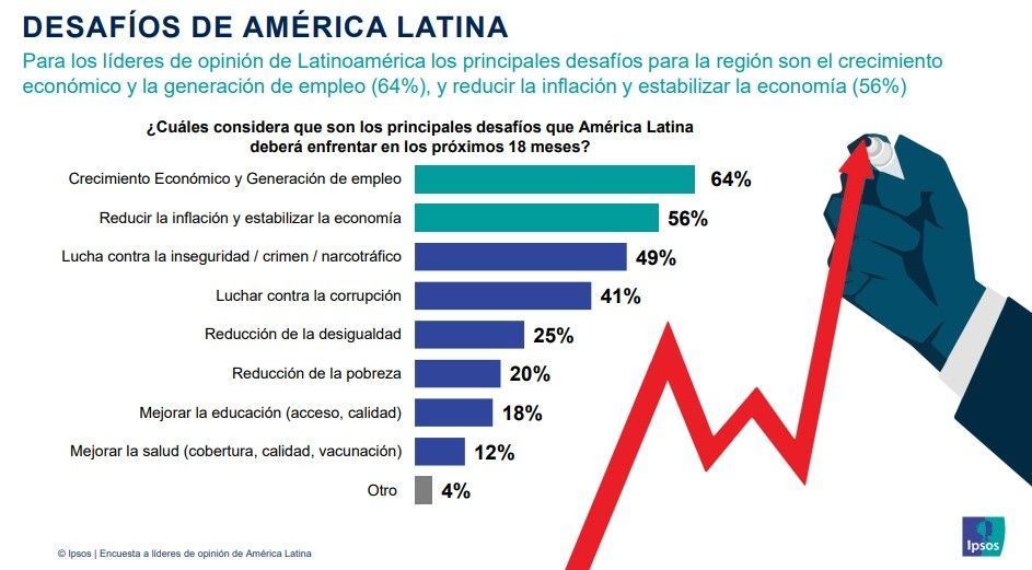 Por último, para los líderes de opinión de la región, los principales desafíos que deberá afrontar Latinoamérica en los próximos 18 meses están relacionados con la economía: 64% menciona al crecimiento económico y la generación de empleo mientras 56% señala reducir la inflación y estabilizar la economía.