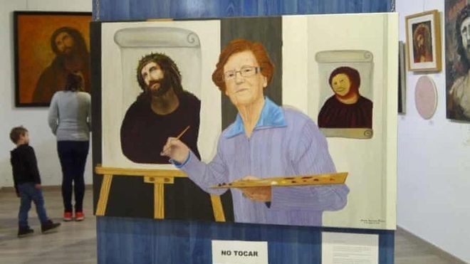 Lo que en teoría iba a ser una restauración, devino una reintepretación de la obra por parte de Cecilia Giménez Zueco, española amateur del pincel que entones tenía 81 años, y en la práctica recibió todo tipo de comentarios, exceptuando cumplidos, y puso en jaque a los críticos de arte.