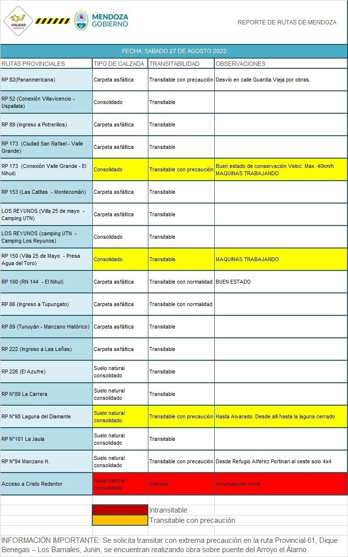 Desde Vialidad Provincial dieron a conocer este sábado 27 de agosto el estado de las rutas y caminos de Mendoza. Las autoridades piden precaución a la hora de transitar por alguno de los tramos.