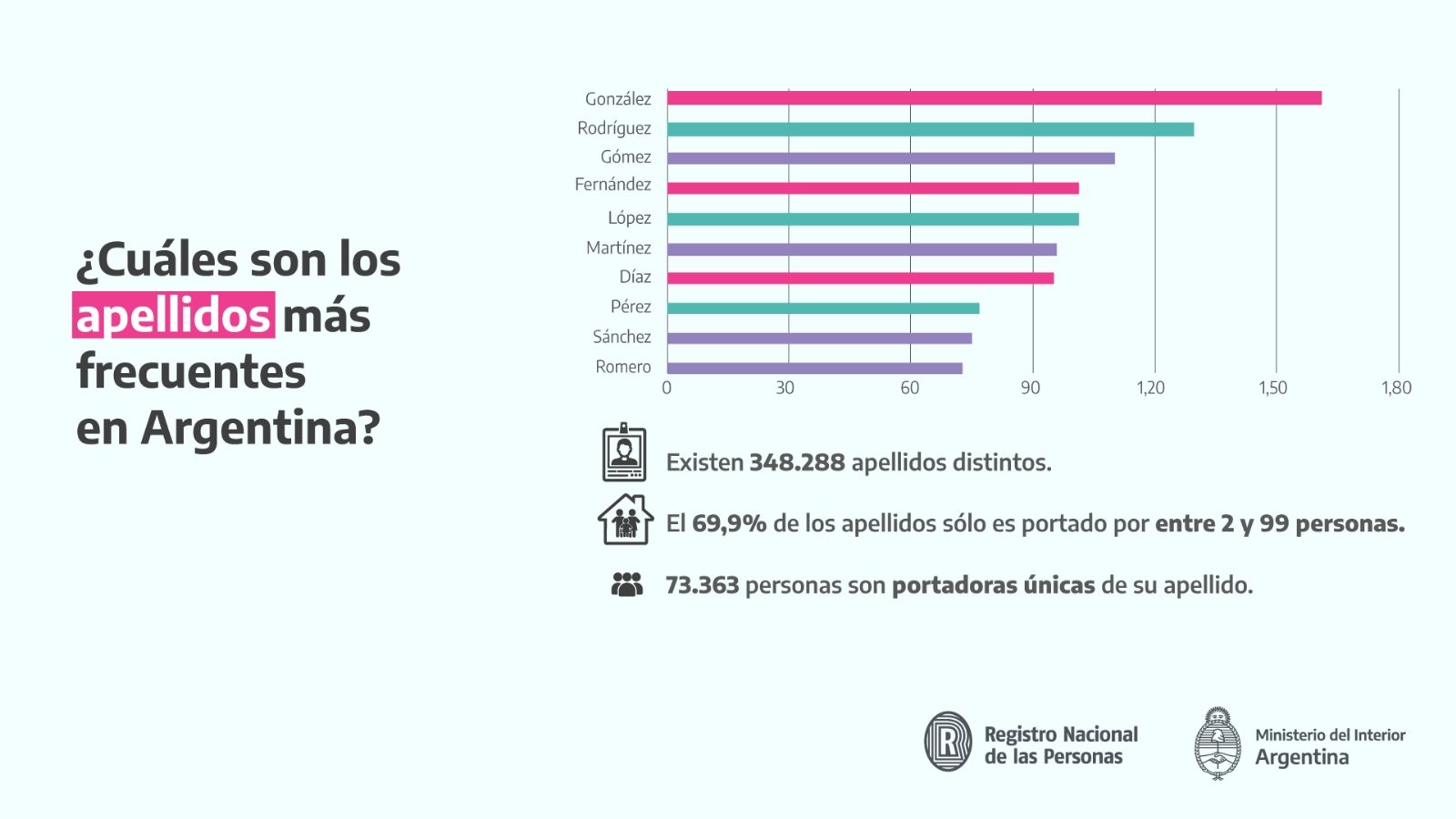 Entre los datos más llamativos del estudio se destacan la existencia de 348.288 apellidos distintos en nuestro país -lo que denota la amplia diversidad de nombres de familia en territorio argentino-; y el hecho de que, al indagar en los 10 apellidos más frecuentes del país, González, Rodríguez y Gómez son los que ocupan los tres primeros puestos de representación a nivel nacional.