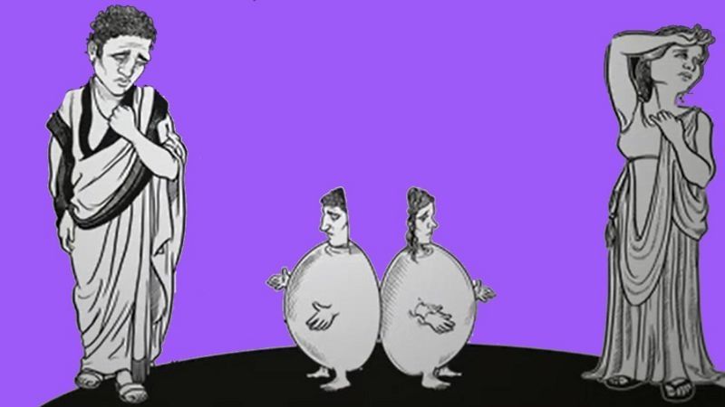 "Compadeciéndose entonces, Zeus inventó otro recurso y trasladó sus órganos genitales hacia la parte delantera (...) para que si en el abrazo se encontraba hombre con mujer, engendraran y siguiera existiendo la especie humana, pero, si se encontraba varón con varón, hubiera, al menos, satisfacción de su contacto, descansaran, volvieran a sus trabajos y se preocuparan de las demás cosas de la vida", contó Aristófanes.