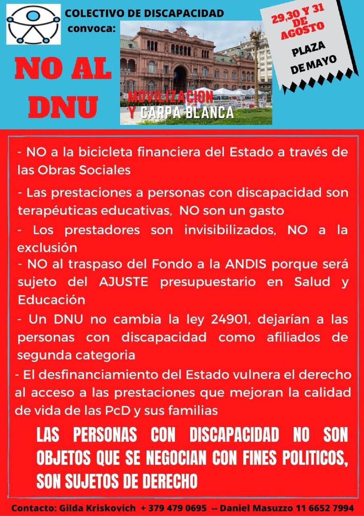 Es que si bien, desde esta área del Gobierno Nacional aseguraron acordar con las obras sociales los pagos de manera que los servicios profesionales y de transporte queden garantizados, los resultados no conformaron al sector que representan a las personas con discapacidad en el país. "Aseguran que han liberado los pagos, pero esto en el fondo no se realizará para todos y ahora. Por otro lado, lo que queremos plantear es que estos pedidos van mucho más allá de estos atrasos. Tienen que ver con un problema de fondo y es que en realidad el presupuesto de discapacidad debería estar entre las prioridades de la Presidencia de la Nación, los fondos deberían llegar desde allí a la Superintendencia y no tendrían que depender exclusivamente de los aportes de la AFIP", destacó Masuzzo. Detalló en este sentido que justamente por eso, el sector ha mostrado un profundo rechazo a la posibilidad de que el Gobierno emita un decreto a través del cual se busca que las obras sociales se "desliguen" de garantizar los servicios a las personas con discapacidad, dejando esta responsabilidad al Estado.