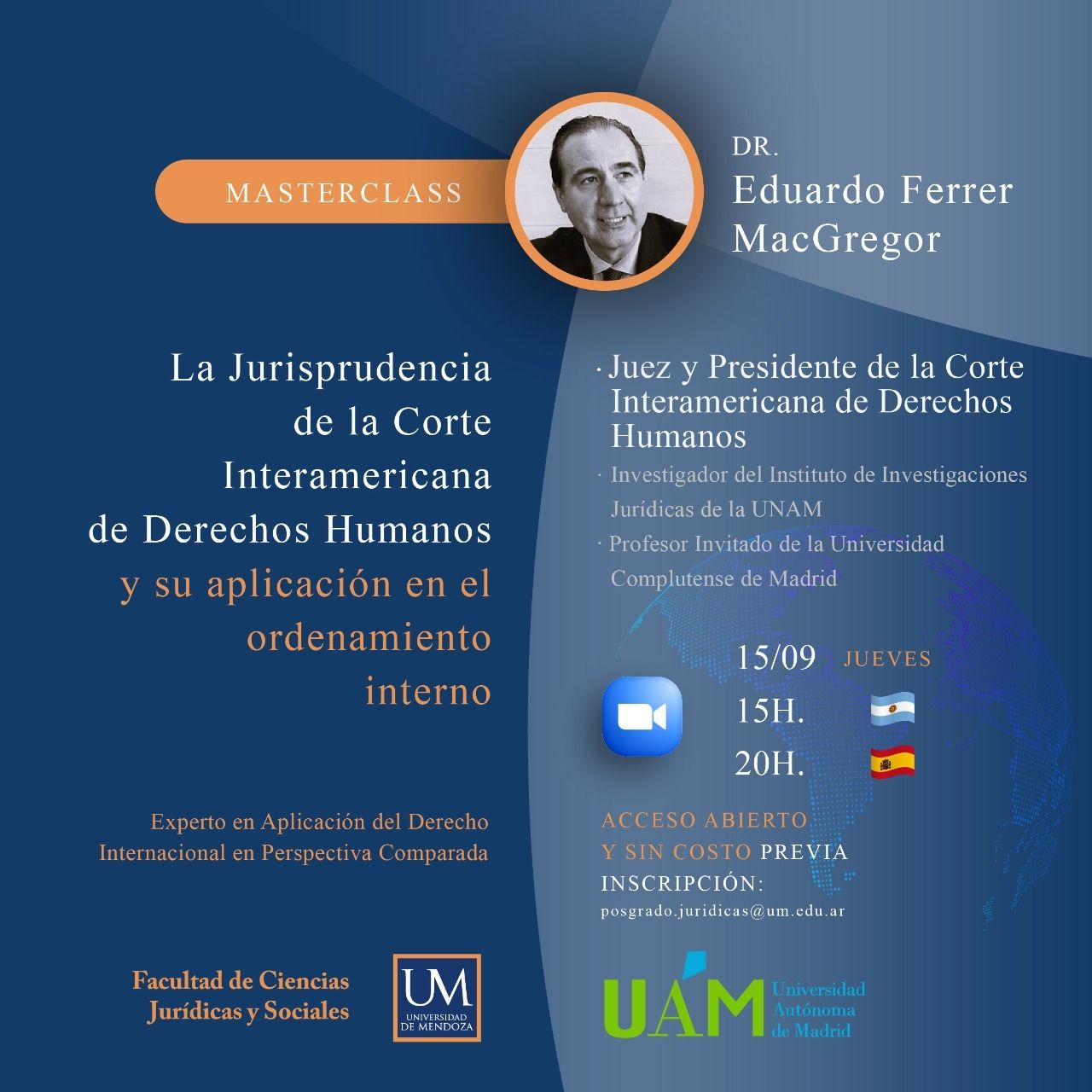 El presidente de la Corte Interamericana de Derechos Humanos (Corte IDH) Eduardo Ferrer Mc-Gregor impartirá la clase de apertura de la segunda edición del Experto en aplicación del Derecho Internacional en perspectiva comparada, estudio propio organizado en forma conjunta entre la Universidad Autónoma de Madrid (UAM) y la Universidad de Mendoza (UM).