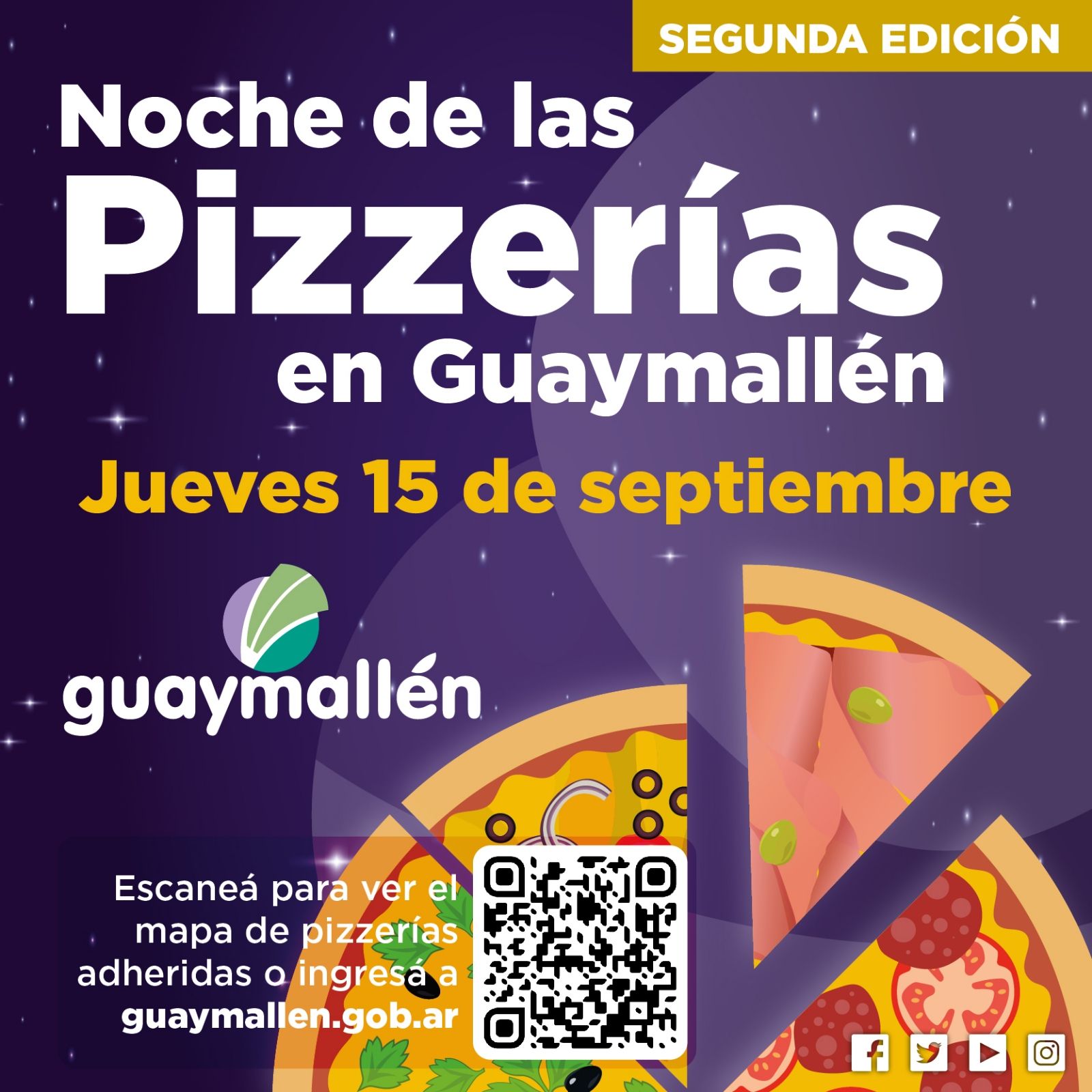 Con el fin de seguir promoviendo el desarrollo económico de los locales gastronómicos del departamento, la Municipalidad de Guaymallén llevará a cabo esta noche la segunda edición de la “Noche de las pizzerías”. Será este jueves 15 de septiembre, de 20 a 1, con más de 70 rotiserías, bares y restaurantes dedicados al rubro de la pizza que ofrecerán importantes descuentos.