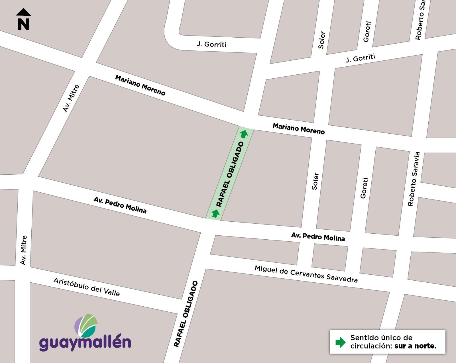 Desde el próximo lunes 19 de septiembre, la calle Rafael Obligado tendrá sentido único de circulación en dirección sur-norte. El cambio se aplicará en el tramo comprendido entre Mariano Moreno y Pedro Molina, a la altura del distrito homónimo.