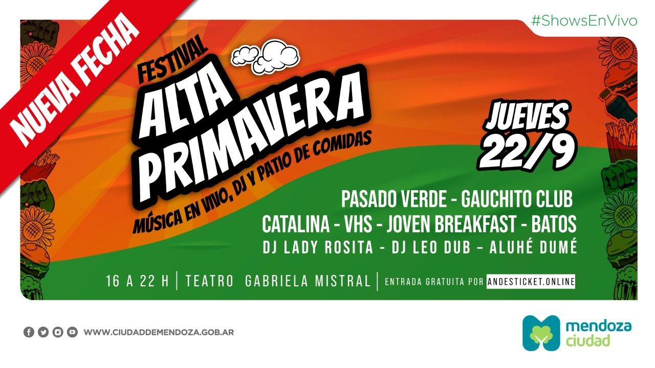 La Ciudad de Mendoza también informó que reprogramará la celebración, pero para el día jueves. "La Ciudad de Mendoza comunica que por el pronóstico de mal tiempo se reprogramará el evento Alta Primavera para el jueves 22. El festejo previsto para este miércoles 21 de septiembre, Día del Estudiante, se realizará al día siguiente en el mismo lugar (teatro Gabriela Mistral) y mantendrá sin cambios la grilla artística".
