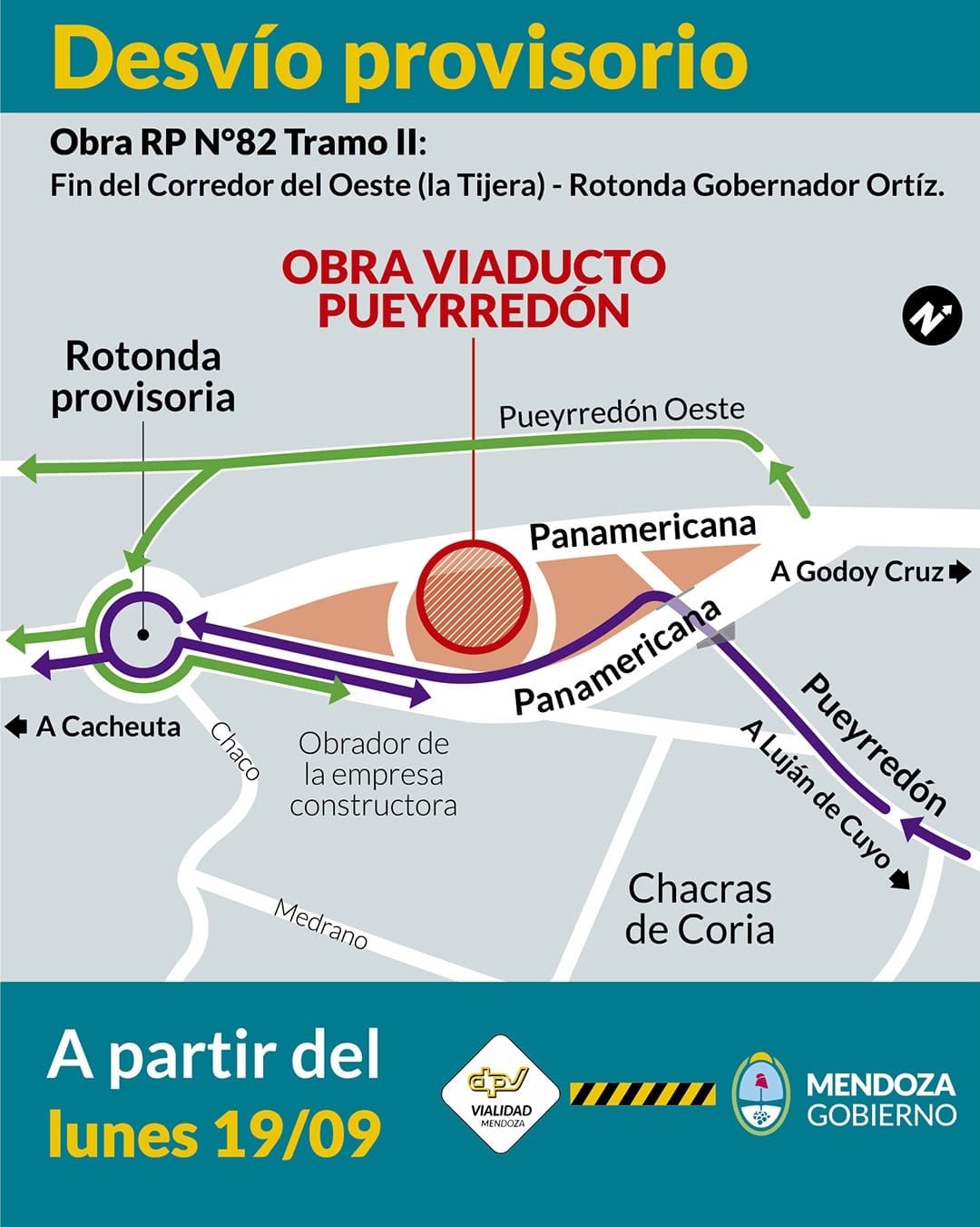 Desde este lunes 19 de septiembre, y como parte de las obras en la ruta provincial 82, comenzarán a operar los desvíos provisorios en la rotonda de Panamericana y calle Pueyrredón, en Luján de Cuyo, un importantísimo nudo vial, a través del cual se accede hacia Chacras de Coria al Este y a los barrios de calle La Unión, hacia el Oeste, informó la Dirección Provincial de Vialidad.