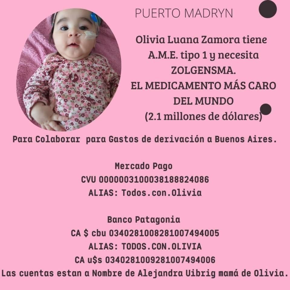Olivia Luana Zamora es una bebé de tan solo 5 meses de la ciudad de Puerto Madryn, Chubut. La pequeña fue diagnosticada el 29 de agosto con Atrofia Muscular Espinal (AME) tipo 1 y ahora sus papás lanzaron una campaña para recaudar fondos para poder pagar el medicamento más caro del mundo.