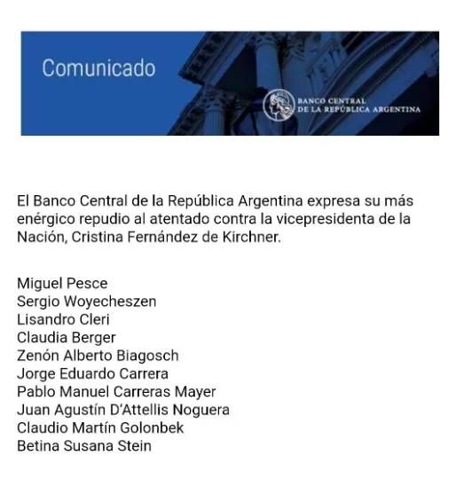 Apenas unas horas después del atentado contra Cristina Fernández de Kirchner, desde el Banco Central de la República Argentina emitieron un comunicado firmado por los directivos en el que confirmaron que el viernes no habrá actividad en las entidades bancarias de todo el país. Tampoco funcionarán los mercados.