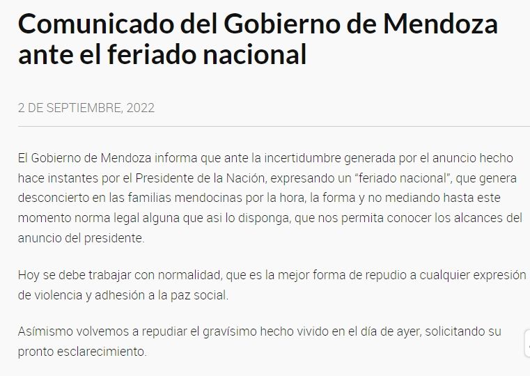 El gobierno de Suárez manifestó su repudio al atentado e informó que "ante la incertidumbre generada por el anuncio hecho hace instantes por el presidente de la Nación, expresando un 'feriado nacional', que genera desconcierto en las familias mendocinas por la hora, la forma y no mediando hasta este momento norma legal alguna que así lo disponga, que nos permita conocer los alcances del anuncio del presidente, hoy se debe trabajar con normalidad, que es la mejor forma de repudio a cualquier expresión de violencia y adhesión a la paz social".