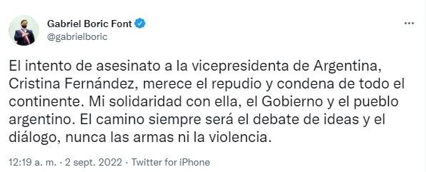 Uno de los primeros mandatarios en hacerse eco de la situación fue el presidente de Chile, Gabriel Boric, quien repudió el intento de magnicidio y afirmó que "el camino siempre será el debate de ideas y el diálogo, nunca las armas ni la violencia".