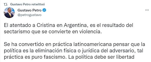 Desde Colombia, Gustavo Petro, el nuevo presidente del país, twitteó: "El atentado a Cristina en Argentina, es el resultado del sectarismo que se convierte en violencia. Se ha convertido en práctica latinoamericana pensar que la política es la eliminación física o jurídica del adversario, tal práctica es puro fascismo. La política debe ser libertad".