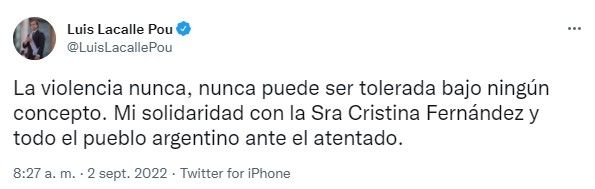 El uruguayo Luis Lacalle Pou escribió hoy: "La violencia nunca, nunca puede ser tolerada bajo ningún concepto. Mi solidaridad con Cristina Fernández y todo el pueblo argentino ante el atentado".