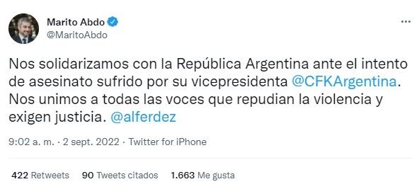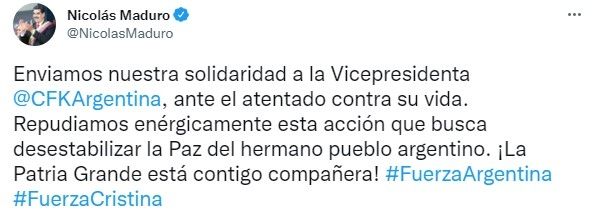 "Enviamos nuestra solidaridad a la vicepresidenta, ante el atentado contra su vida. Repudiamos enérgicamente esta acción que busca desestabilizar la Paz del hermano pueblo argentino. ¡La Patria Grande está contigo compañera! #FuerzaArgentina #FuerzaCristina", expresó el mandatario venezolano, Nicolás Maduro, en Twitter.