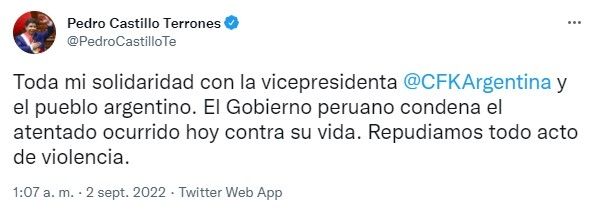 El presidente peruano, Pedro Castillo, expresó también su solidaridad con la vicepresidenta. "El Gobierno peruano condena el atentado ocurrido hoy contra su vida. Repudiamos todo acto de violencia", afirmó.