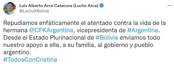 Desde Bolivia, Luis Arce, afirmó en su cuenta de Twitter: "Repudiamos enfáticamente el atentado contra la vida de la hermana @CFKArgentina, vicepresidenta de #Argentina. Desde el Estado Plurinacional de #Bolivia, enviamos todo nuestro apoyo, a ella, su familia, el Gobierno y el pueblo argentino. #TodosConCristina".