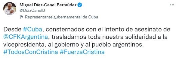 Desde Cuba, el representante gubernamental de la isla, Miguel Díaz-Canel expresó: "Desde Cuba, consternados con el intento de asesinato de Cristina Fernández de Kirchner, trasladamos toda nuestra solidaridad a la vicepresidenta, al gobierno y al pueblo argentinos".