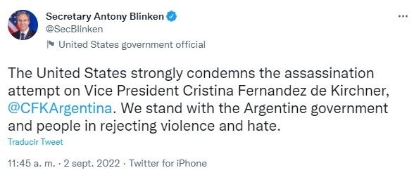 Este viernes también el secretario de Estado de EEUU, Antony Blinken, condenó enérgicamente el atentado. “Estados Unidos condena enérgicamente el intento de asesinato de la vicepresidenta Cristina Fernández de Kirchner, @CFKArgentina. Estamos con el gobierno y el pueblo argentinos en el rechazo de la violencia y el odio”, indicó el funcionario del Ejecutivo de Joe Biden en Twitter.
