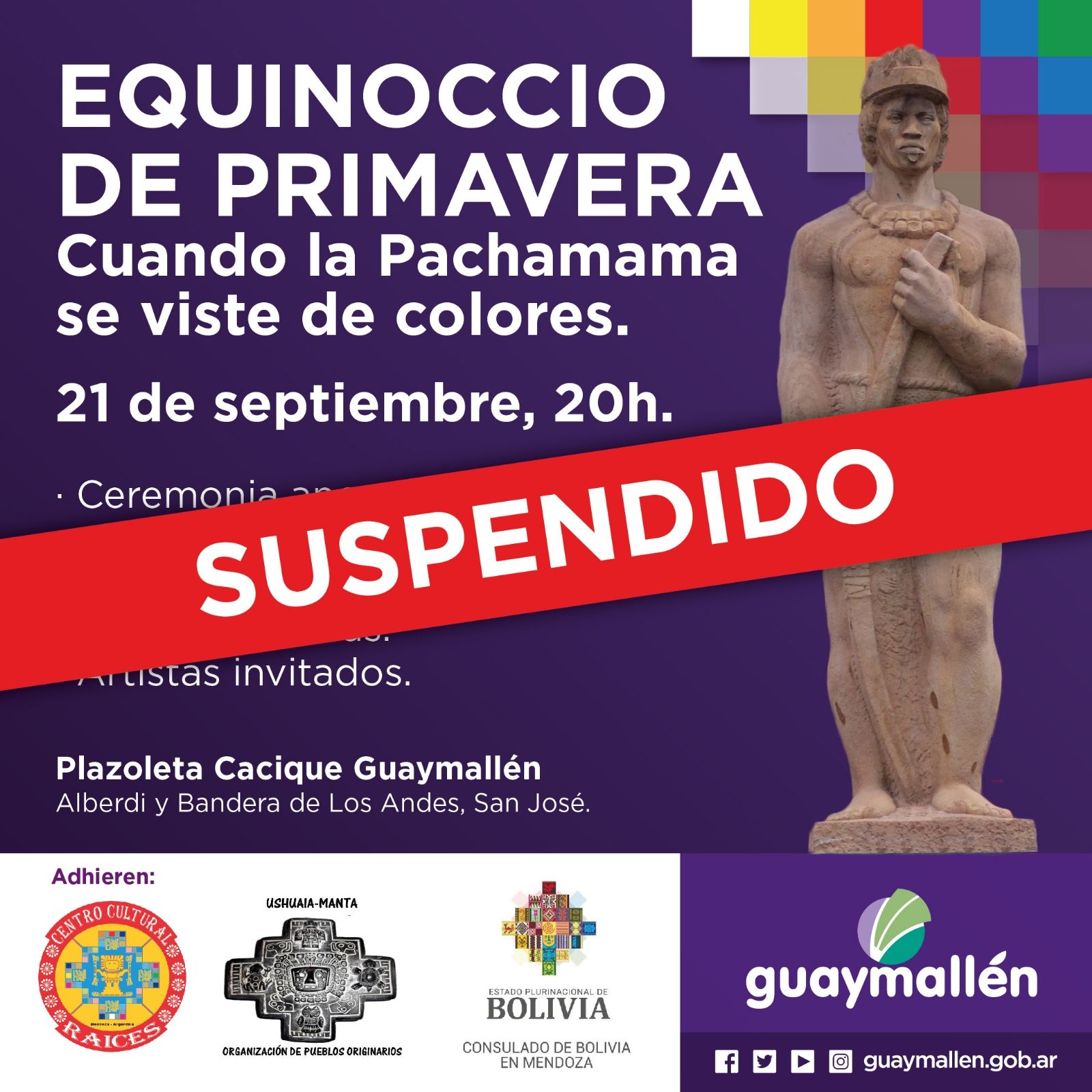 "La Municipalidad de Guaymallén informa que se suspende el evento Equinoccio de primavera, debido a las condiciones meteorológicas que anticipa el pronóstico para este miércoles 21 de septiembre", detallaron desde la oficina de prensa.