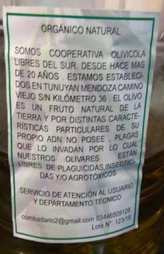 La etiqueta del aceite de oliva consignaba datos de registros en la provincia de Buenos Aires, pero el Ministerio de Desarrollo Agrario afirmó que el producto es "inexistente". Debido a que en el rotulado se nombraba a la provincia de Mendoza, se consultó a la Dirección de Nutrición e Higiene de los Alimentos de dicha provincia que no encontró información alguna en su base de datos.