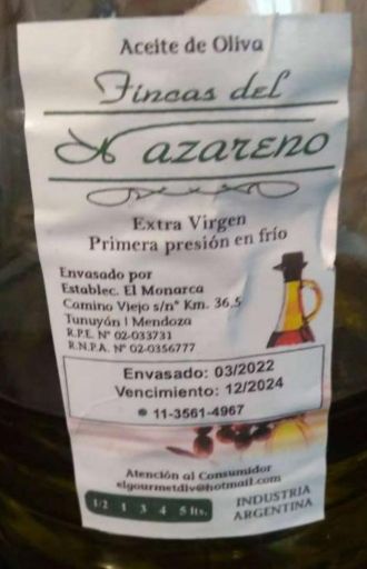Se trata del producto "Aceite de oliva marca ‘Fincas del Nazareno’, - Extra virgen - Primera presión en frío". La marca falsificó los registros del producto y del establecimiento, según informó la Anmat.