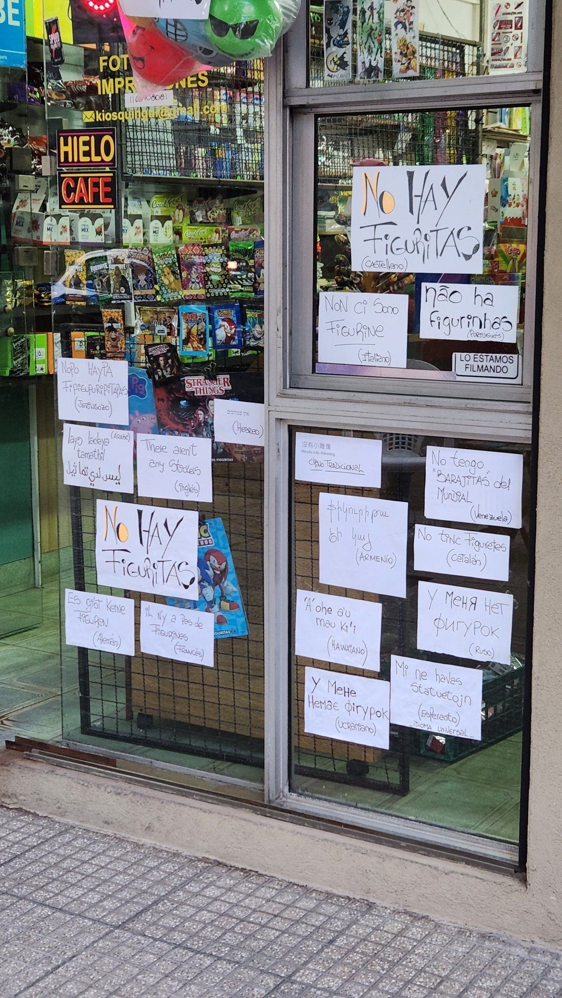 Esta puerta repleta de carteles es quizás una de las más virales en redes, ya que el kiosquero se tomó el trabajo de traducir a todos los idiomas "no hay figuritas".