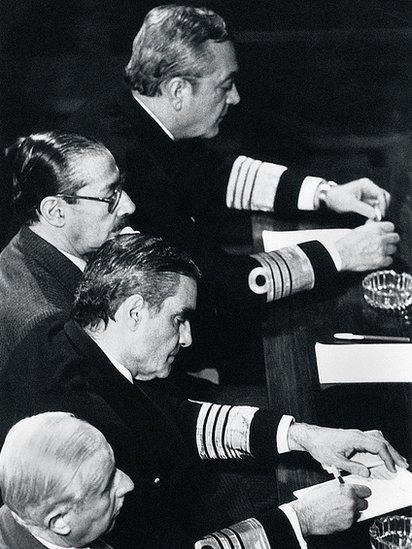 En el centro de la imagen dos de los comandantes más poderosos del gobierno militar, Rafael Videla (de lentes) y Emilio Massera (escribiendo).