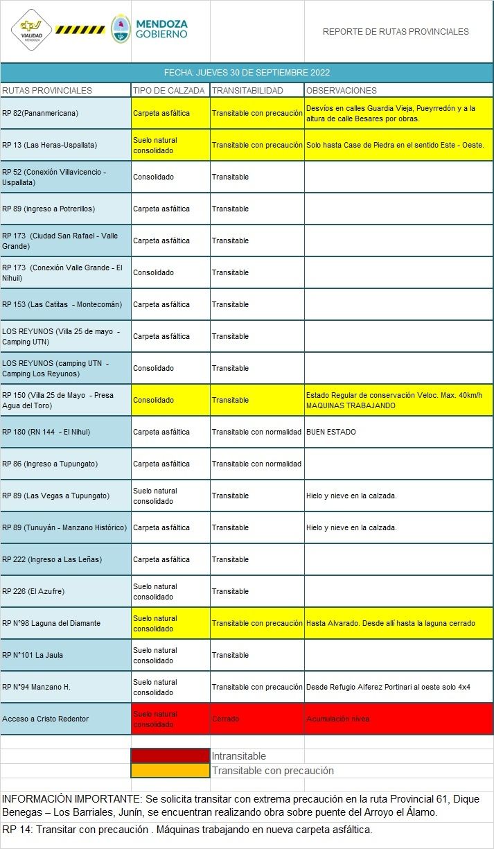 Desde Vialidad Provincial dieron a conocer el estado de las rutas y caminos de Mendoza. Las autoridades piden precaución a la hora de transitar por alguno de los caminos.