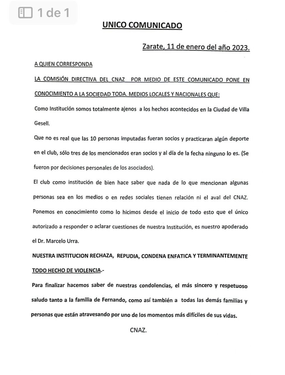 "El club como institución de bien hace saber que nada de lo que mencionan algunas personas sea en los medios o en redes sociales tienen relación ni el aval del CNAZ. Ponemos en conocimiento como lo hicimos desde el inicio de todo esto que el único autorizado a responder o a aclarar cuestiones de nuestra institución, es nuestro apoderado el doctor Marcelo Urra", subrayó el club.