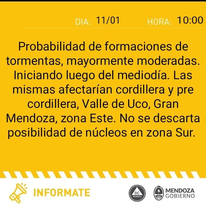 El comunicado de Defensa Civil expresa que hay probabilidad de formaciones de tormentas, mayormente moderadas que tendrán inicio luego del mediodía. "Las mismas afectarán cordillera y pre cordillera, Valle de Uco, zona Este y Gran Mendoza", destaca el comunicado.