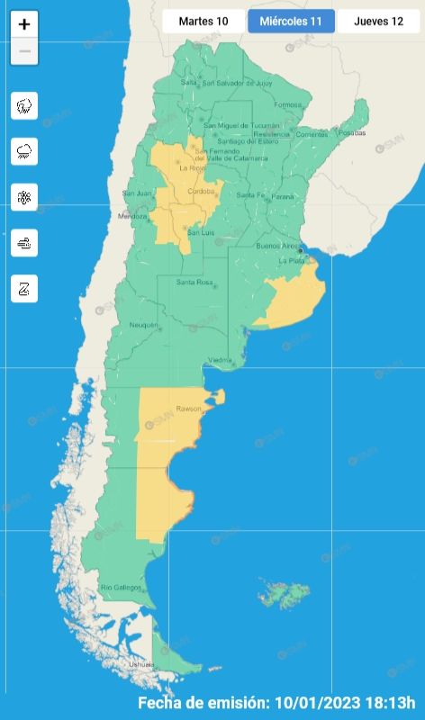 Según el SMN, la alerta meteorológica amarilla por fuertes tormentas, con ocasional caída de granizo e intensa actividad eléctrica, rige para las provincias de Mendoza, San Juan, San Luis, Buenos Aires, Córdoba, La Rioja y el sur de Catamarca, mientras que en las provincias de Santa Cruz y Chubut hay vigente una alerta amarilla debido a las intensas lluvias pronosticadas para este miércoles.