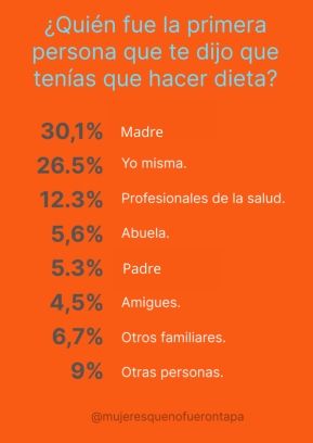 Conviene, antes de entrar en las razones que llevan a una mujer a hacer dieta, detenerse en un dato clave: suelen ser las madres (30,1%) las que más instan a las mujeres a hacer dieta. Y el segundo "juez" que manda a adelgazar suele ser una misma (26,5%).