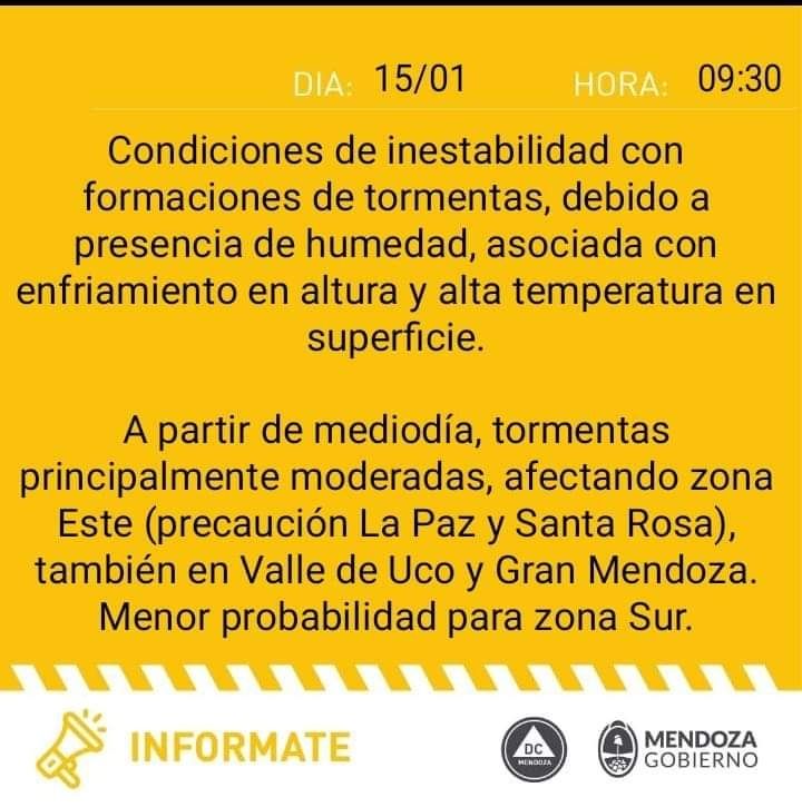 La entidad indica que la provincia "será afectada por tormentas de variada intensidad, algunas localmente fuertes. Las mismas podrán estar acompañadas por fuertes ráfagas, caída de granizo, importante actividad eléctrica y abundante caída de agua en cortos períodos. Se esperan valores de precipitación acumulada entre 10 y 25 mm, pudiendo ser superados localmente".