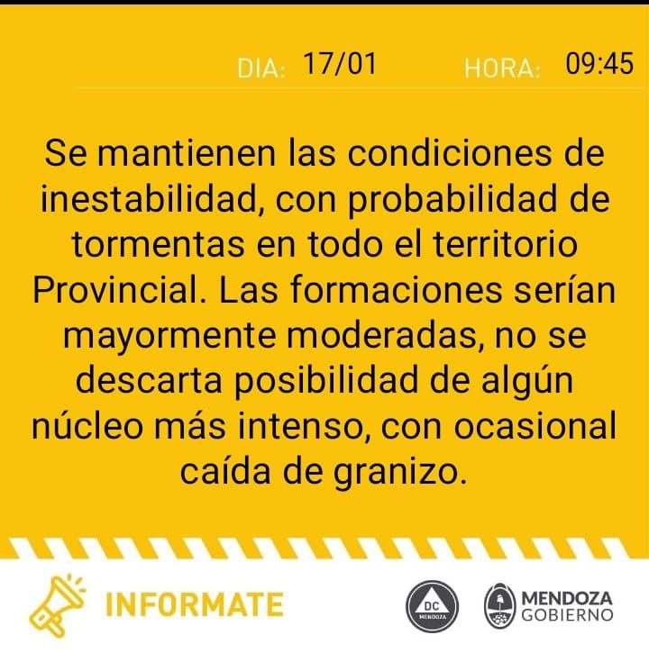 El comunicado de Defensa Civil expresa que "se mantienen las condiciones de inestabilidad con probabilidad de tormentas en todo el territorio provincial".
