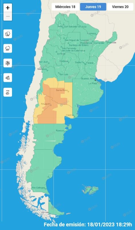 Hacia horas de la tarde y la noche se registrarán tormentas en todo el territorio provincial a excepción de los departamentos de Lavalle, Santa Rosa, La Paz y Rivadavia. El fenómeno tendrá mayor intensidad en los departamentos del sur provincial, por esa razón, el SMN emitió una alerta naranja para el departamento de Malargüe y otra amarilla para San Rafael.