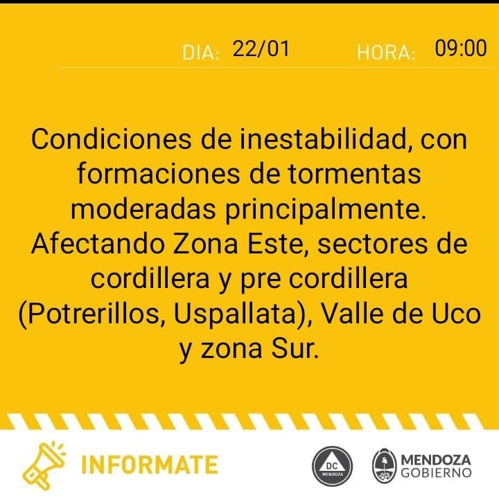La inestabilidad en Mendoza continuará por lo menos hasta el viernes. Desde el SMN indicaron que las tormentas se presentarán, mayormente, hacia la tarde noche.