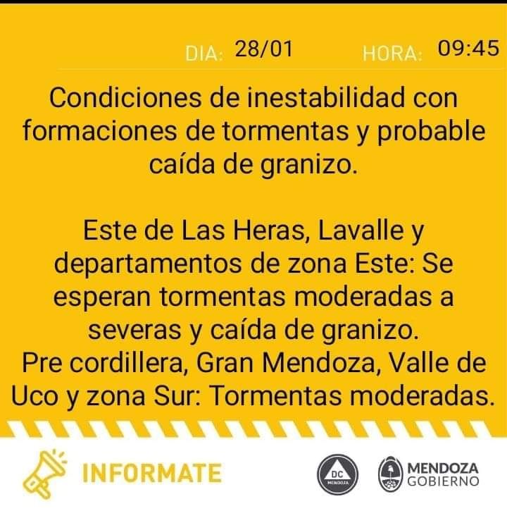 El mismo volverá a afectar al este mendocino de Las Heras, La Paz, Lavalle, San Martín y Santa Rosa y desde el SMN remarcaron que el alerta amarillo podría activarse en horas de la noche. Además, desde Defensa Civil indicaron que se espera probable caída de granizo en esos distritos, mientras que en el Gran Mendoza y el Sur solamente tormentas moderadas.