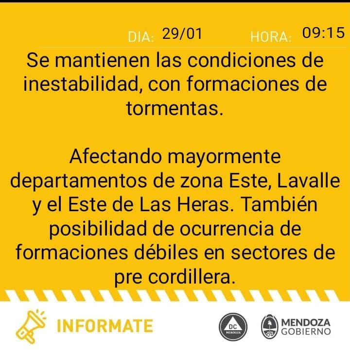 Defensa Civil lanzó una alerta amarilla debido a la probabilidad de que se registren tormentas moderadas en varios departamentos del Gran Mendoza. Según indican los pronósticos, los pronósticos de inestabilidad se mantienen en la región.