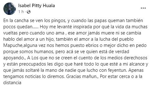Isabel Huala, madre de Facundo Jones Huala, realizó una inquietante publicación en Facebook minutos después de la detención del activista mapuche. En el posteo, compartió una canción titulada “Libertad o muerte” de la banda Wechekeche ñi Trawün, que hace referencia directa a los presos mapuches.