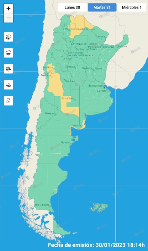 Según el SMN, la alerta meteorológica amarilla por fuertes tormentas, con abundante caída de agua en cortos períodos de tiempo, caída de granizo y fuertes ráfagas de viento rige para las provincias de Mendoza, Jujuy, Salta, Formosa, La Pampa, San Juan y el este de Río Negro.
