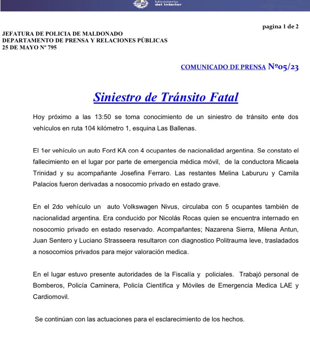 La Jefatura de policía de Maldonado, Uruguay; a través de su departamento de prensa y relaciones públicas, emitió un comunicado oficial con respecto al accidente vial que le costó la vida a dos jóvenes argentinas en la zona de Manantiales, Punta del Este y por el que se encuentra comprometida la salud de varias personas más.