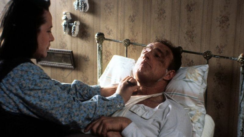 Annie Walker (Kathy Bates) con el objeto de su devoción y obsesión, el desafortunado novelista Paul Sheldon (James Caan).