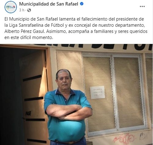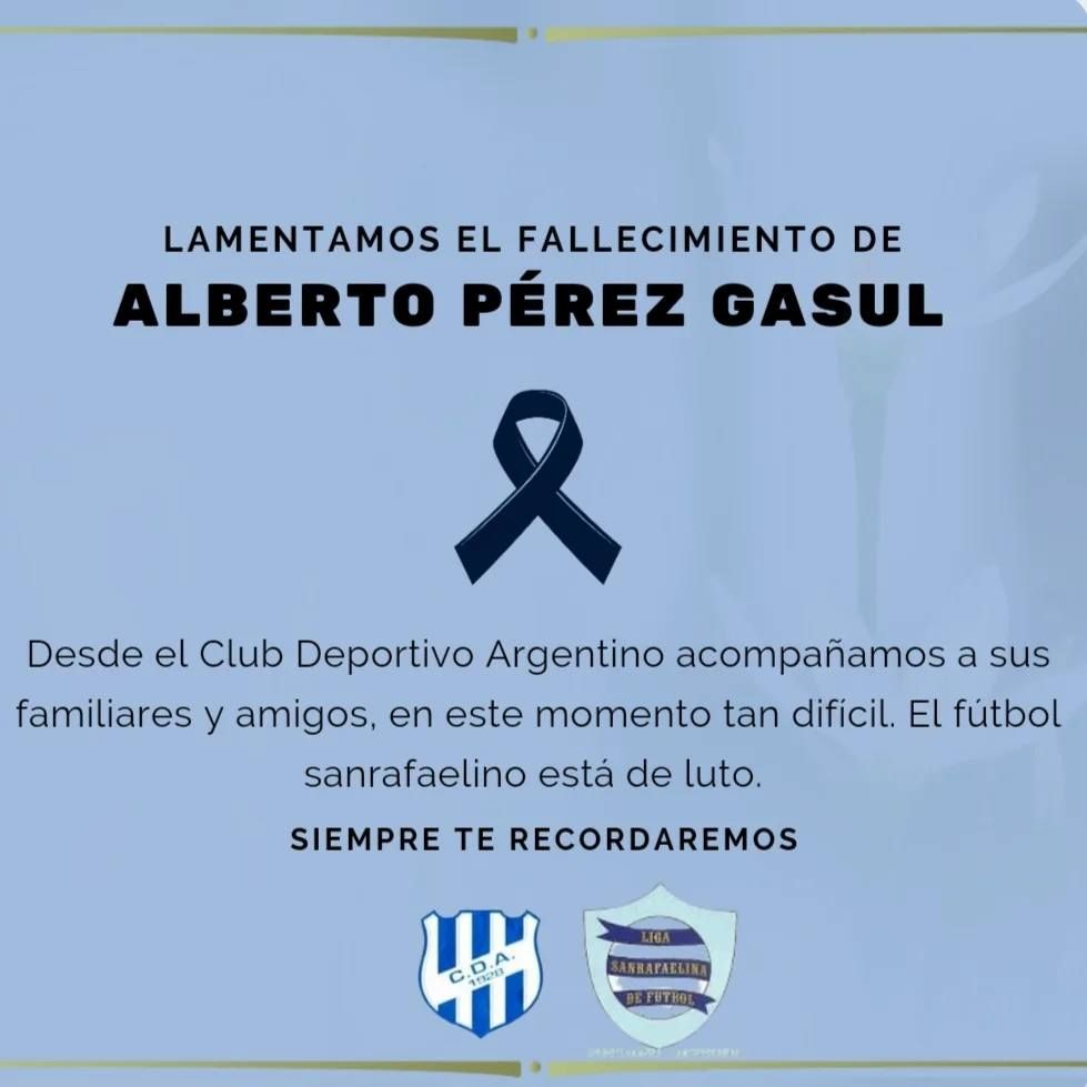 Falleció el presidente de la Liga Sanrafaelina de Fútbol Alberto Pérez Gasul a los 67 años de un infarto. El dirigente deportivo presidió la institución durante 27 años y esa trayectoria lo convirtió en el segundo miembro más antiguo del Consejo Federal de la AFA en su cargo en el interior del país.