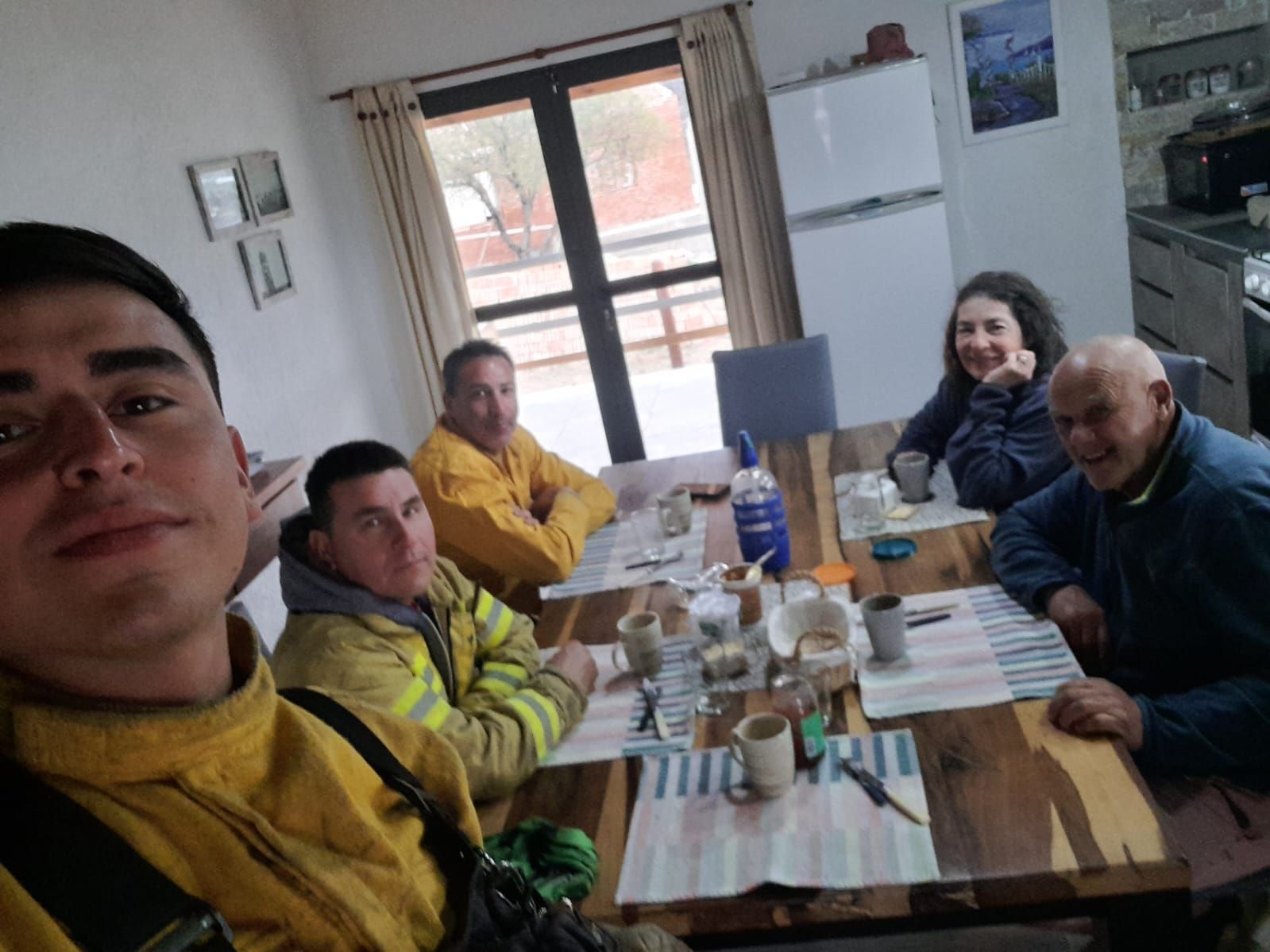 A pocos metros se da otra situación muy particular. Tres bomberos provenientes de la localidad de Los Cóndores, que llegaron con una dotación de su cuartel para colaborar con el voraz incendio en Cabalango, disfrutan del desayuno que les prepara Miguel Trigo Conte.
