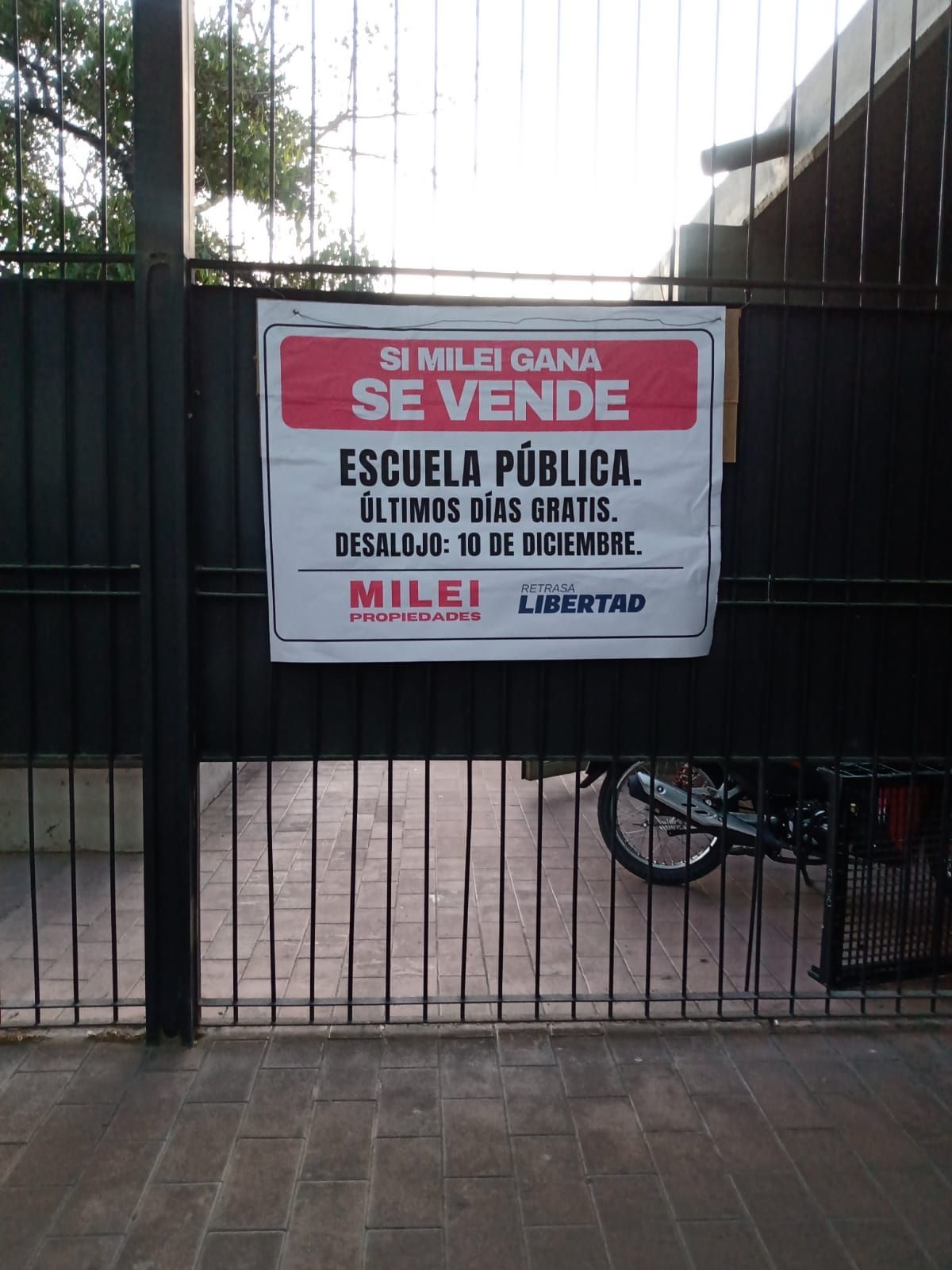 Los carteles en cuestión llevan el mensaje: "Si Milei gana se vende. Escuela pública. Últimos días gratis. Desalojo: 10 de diciembre," seguido del texto "Milei propiedades" y la frase "Retrasa la libertad."