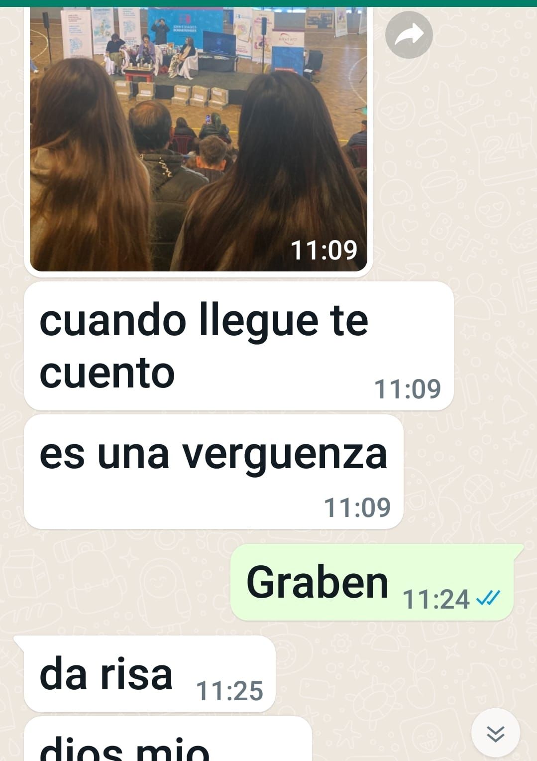 "Vinimos, nos dieron de comer y tomar. Llega la mina que tiene que hablar y hace la V. Ya no saben qué hacer. Es una vergüenza", le escribió uno de los jóvenes a su padres luego de asistir a la charla que Dora Barrancos dio en Bolívar en el marco del programa Aguas bonaerenses.