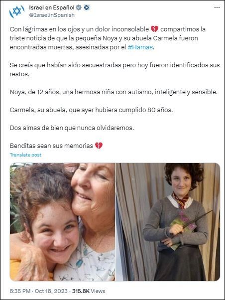 "Con lágrimas en los ojos y un dolor inconsolable, compartimos la triste noticia de que la pequeña Noya y su abuela Carmela fueron encontradas muertas, asesinadas por el Hamás. Se creía que habían sido secuestradas pero hoy fueron identificados sus restos", posteó la cuenta de "X" de @IsraelinSpanish.