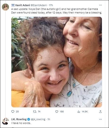 La autora de Harry Potter también replicó en sus redes la noticia con un triste mensaje: "Una triste actualización: Noya Dan (la niña autista) y su abuela Carmela Dan fueron encontradas muertas hoy, después de 12 días. Que su recuerdo sea una bendición". Además, acotó un segundo tweet para mostrar su angustia ante el fatal desenlace: "No tengo palabras".