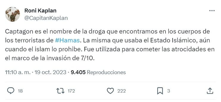 "Captagon es el nombre de la droga que encontramos en los cuerpos de los terroristas de #Hamás. La misma que usaba el Estado Islámico, aún cuando el islam lo prohíbe. Fue utilizada para cometer las atrocidades en el marco de la invasión de 7/10", posteó este mediodía en su cuenta de X (ex Twitter) Roni Kaplan, el portavoz de las Fuerzas de Defensa de Israel.